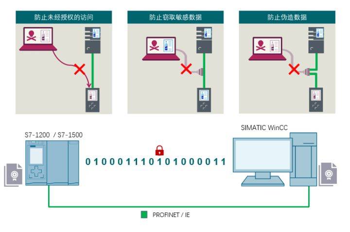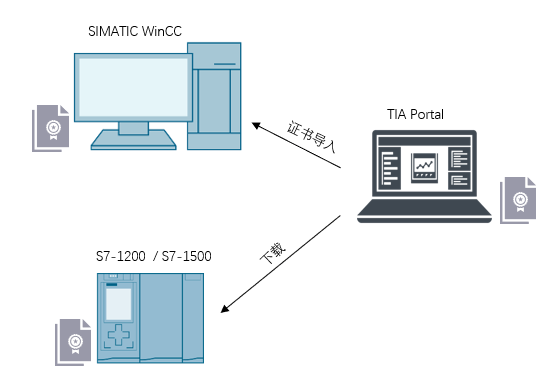 S7-1200/1500和SIMATIC WinCC通过签字证书建立信任关系(握手)以确保数据的真实性和完整性;使用TLS协议加密通信数据(数据交换)以确保数据的机密性。