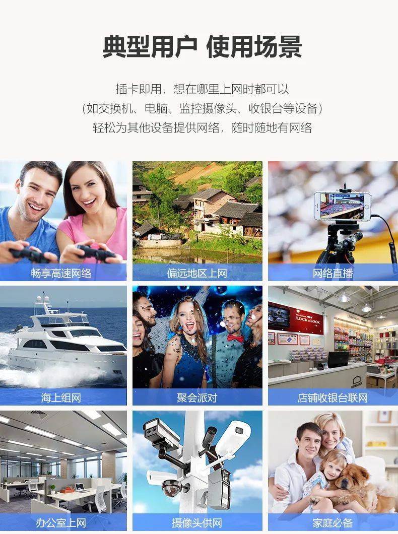 插卡即用,无论何处您想上网,您都可以轻松地连接到其他设备(如开关、电脑、监控摄像机、自动取款机等),随时随地有网络,畅享高速网络,偏远地区上网,网络直播,海上组网,店铺收银台联网,聚会派对,办公室上网,摄像头供网