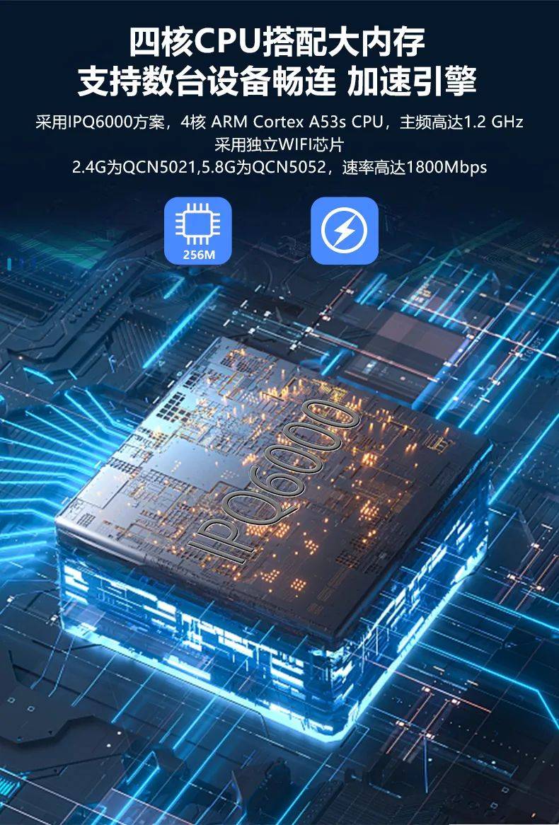 它使用IPQ600,四个核心ARMCortexA53sCPU,最大1个主频。 2GHz的独立 WIFI芯片,2.4G是QCN5021,5.8G是QCN5052,最大1800Mbps