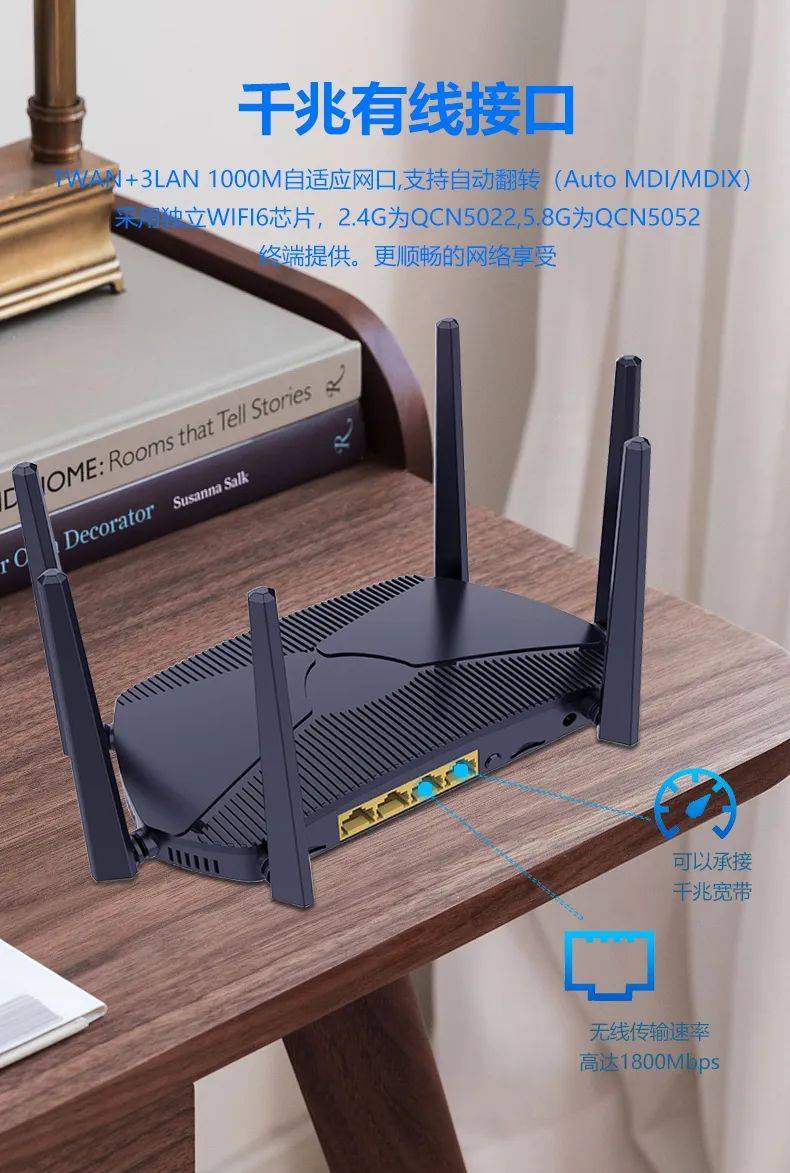 1WAN+3LAN100M适配网络端口,支持 Auto MDI/MDIX与独立的 WIFI6芯片,2.4G是QCN5022.5.8G为QCN5052终端提供。更顺畅的网络享受,可以承接千兆宽带,无线传输速度最大1800Mbps