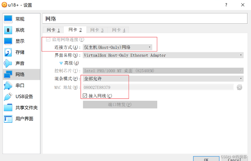 默认情况下,VirtualBox只能启用第一个网络卡,而第二个网络卡启动需要手动修改配置文件才能生效。