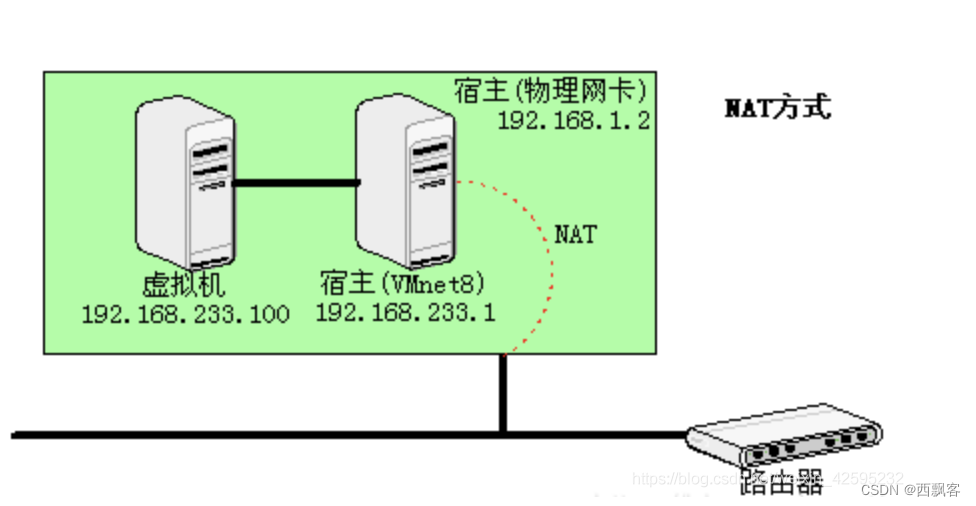 NAT(网络地址转换模式),如下图所示,虚拟机通过自己的门户,首先将请求转移到主机上,然后使用主机的物理网络卡访问外部网络,特点: 主机可以支持多模式虚拟机连接外部网络.本地虚拟机通常更经常使用这种方法。