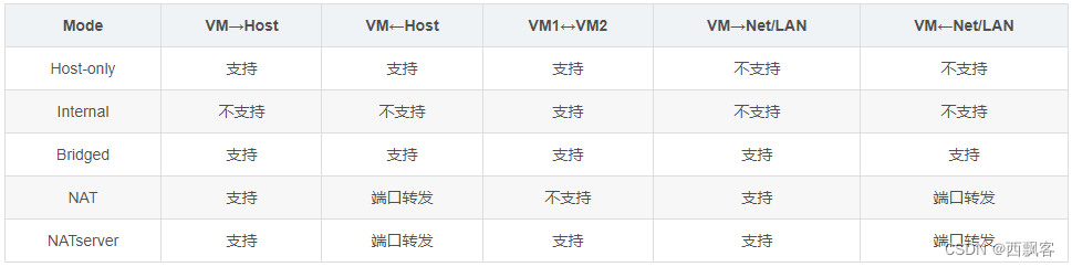 VirtualBox支持的五个网络类型在表中显示(还有四个说法说NAT和NAT服务器并不很明显,称为NAT)。