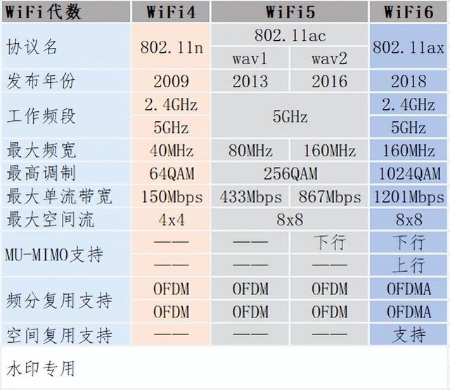 亲友直接绘制的图画,看看无线网络技术的发展,WiFi4实际上是一条长河,在历史上一直延续下来,如果不是一台老电脑,基本上你不能看见他。现在市场上的设备主要使用Wi - Fi 5标准,最代表性的无线网络卡和路由器分别是Intel AC9260(AC9560)和一些Xun K2P路由器。基本上能够满足日常需要,但是, 由于 它 不 支持 MU - MIMO 升级,所以当多个网络设备同时上网时,往往有大量延误的案例。Wi-Fi 6在最大单流带宽和其他参数方面比Wi-Fi 5更好,最重要的是,它正式支持 MU-MIMO的升级,这大大减少了网络延迟。