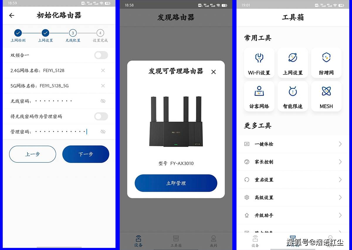 其实,为父母配置路由器,我还做了很多家庭作业,最后选择了AX300路由器。这就是为什么我们选择了AX300路由器,首先,考虑到高性能和高传输,二是考虑便携性。飞行的AX300路由器配备了一个特殊的APP,下载一个特殊的应用程序到您的手机上,点开APP,即可轻松连接,设置自己的Wi-Fi密码并管理密码。AX300路由器还支持WPS功能,朋友来到家中,不可忘记的密码可以在WPS键上点击,使它容易连接到Wi-Fi。