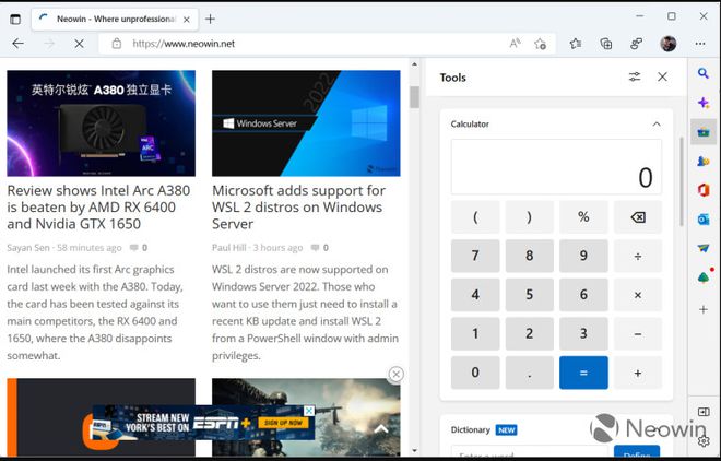 如果你正在使用Canary Channel的Microsoft Edge测试版本,你可以预先体验这个早期功能更新。据悉,在EdgeCanary105中,微软提供世界时钟、计算器、词典、翻译器、单位转换器和网络速度测试等工具,打开侧栏访问,找到它.