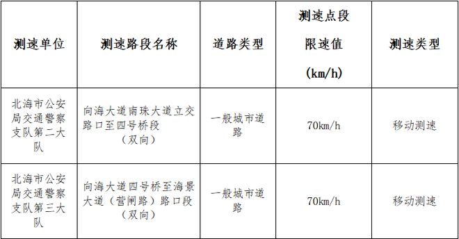 为进一步加强道路交通管理工作,维护道路交通安全畅通,提高道路通行效率,现将北海警察署交通警察处新增测速点段公布如下: