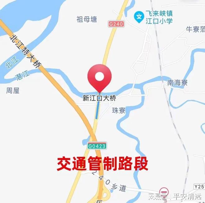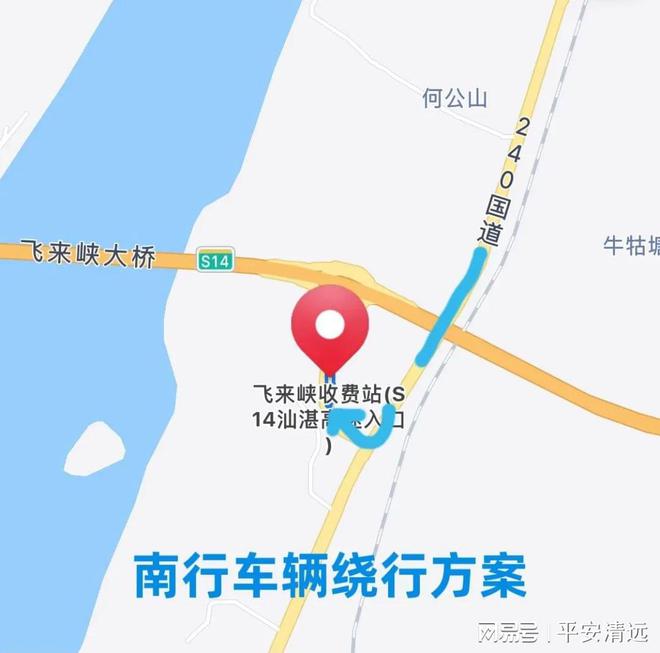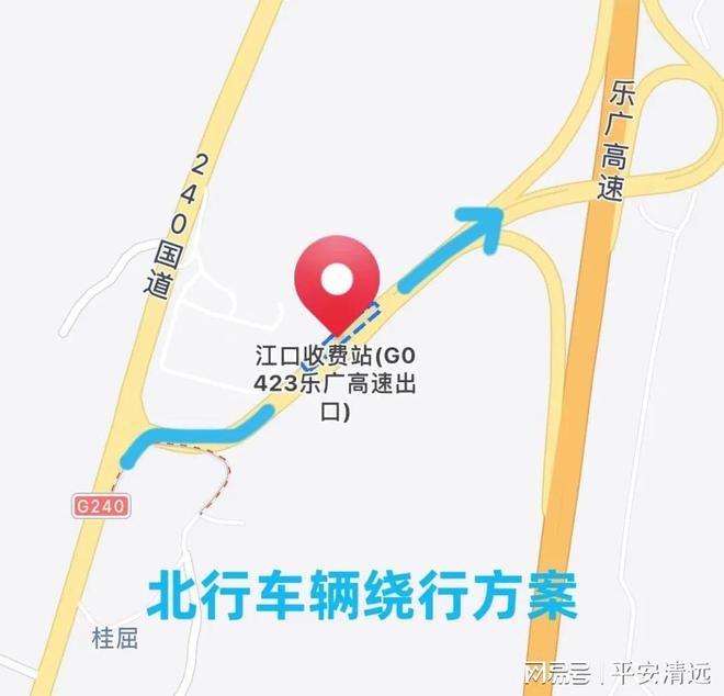 因防汛工作需要,清大市新江关桥G240国道段现需临时交通管制。经新 Gangguchi桥段前往G240北侧(向英格兰方向)的车辆,经新界口铁道大桥段前往广州的G240南线的车辆,请经莱广高速公路界口铁道界口车站。请通过山东高速飞往峡谷站绕过山东高速。
