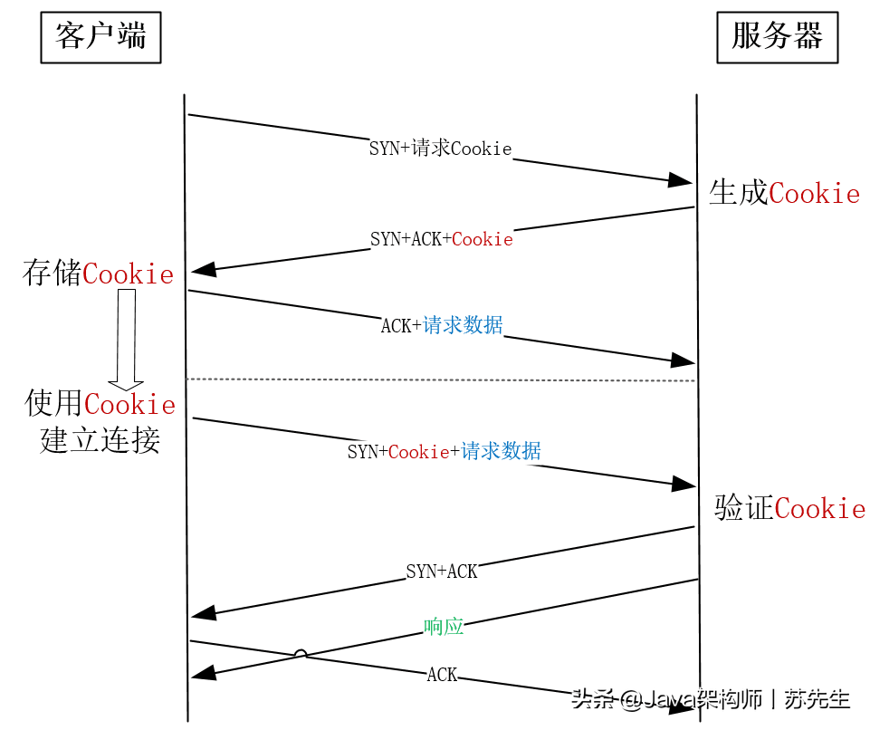 服务器收到后,使用自己的钥匙来验证Cookie的合法性,验证仅在连接成功建立后才进行。要求程序再次处理请求,同时返回SYN+ACK到客户端。尽管客户在收到ACK后将返回ACK,但是服务器可以发送HTTP响应而不等待ACK接收。这减少了由于震动而花费的时间。