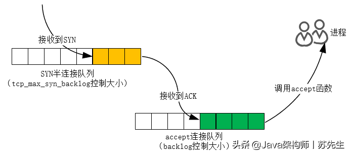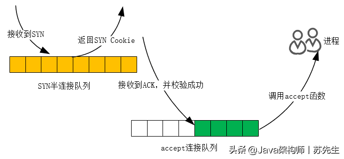 服务器收到ACK后, 连接成功地建立.此时,内核将从SYN半连接队列中删除连接,迁移接受队列,在等待进程调用接受函数时,删除连接。如果进程不能及时调用接受函数,这将使接受队列溢出,最终, 一个好的TCP连接被丢失.