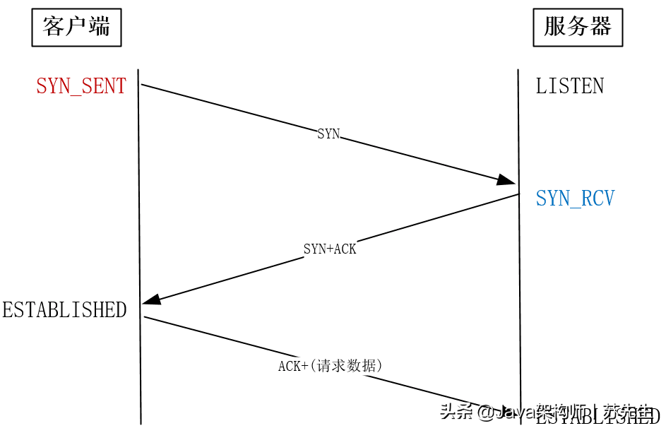 尽管操作系统实现了三个手,但它通过连接向我们揭示了这一过程。让我们更仔细地看一下下面的三个状态的意义。客户发送SYN打开三个握手,在此点,使用netstat命令(用于随后查看连接状态)可以看到客户端的连接状态,即SYN_SENT。它只是发送SYN。