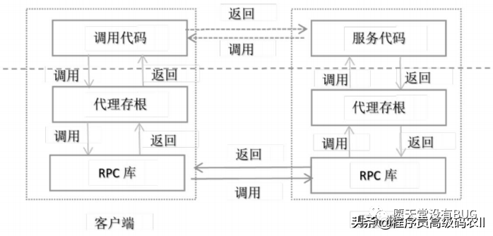 RPC主要使用动态代理模式。RPC框架保护了基本的传输模式(TCP或UDP),序列模式(XML,JSON,二进制)和通信细节。开发人员只需要知道谁提供什么类型的远程服务接口在什么地点,当它们在使用时,无需担心底部通信和调用过程的细节,如下图所示。