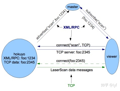 sensor_msgs/LaserScan数据。在节点首先发送有关主题的数据之前,首先将发送的数据信息发送给主机,包括发送的数据类型,topic名字,发送者URI(主机名称+端口)等(上图的主题是扫描,主机名是foo,港口是1234),然后,Theros的主人将这些信息记录在出版商表中(如果没有订阅者,出版商将不实际发送数据);sensor_msgs/LaserScan数据,首先进入 theros master通信,使用XMLRPC获取谁在“扫描”主题上发送数据, theros master返回发送者URIfoo:1234,但URI不用于发送数据;foo:2345然后,用户连接到出版商的数据URI来进行真正的TCP数据传输。从上面的过程可以看出,ros1并不是真正的代理网络架构,因为真正的TCP数据连接不通过罗斯主机.罗斯大师的主要任务是为系统其他节点提供主题登记服务,帮助出版商和订阅者完成连接设置,它负责寻找邻居的功能。它也不是无家可归。因为如果有诺罗斯大师的话,整个罗斯系统的数据连接根本无法建立,这也是ROS1的最大问题之一,单节点失效问题,如果系统运行,罗斯科有故障,整个系统不会正常运作。