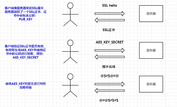 事实上,SSL协议与前节的不对称加密大致相同。在握手过程中,它主要用于交换钥匙,然后在通信过程中使用对称加密进行通信,过程大致如下: