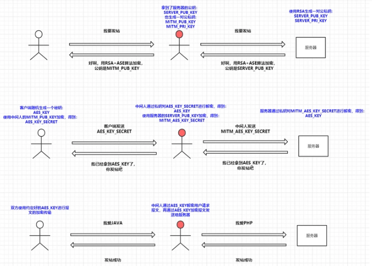 所谓路高一英尺,魔鬼高一英尺,中间人提出了一种新的解密方案来抵制这种加密方法,既然我找不到AES_KEY,然后我将模拟自己作为客户端和服务器边绑定,在用户->中间人的过程中中间人模拟服务器的行为,这样,你可以得到用户请求的明确声明,在中间人->服务器的过程中中间人模拟客户端行为,所以你可以得到服务器的响应消息,这样,中间人就会攻击: