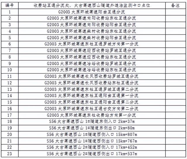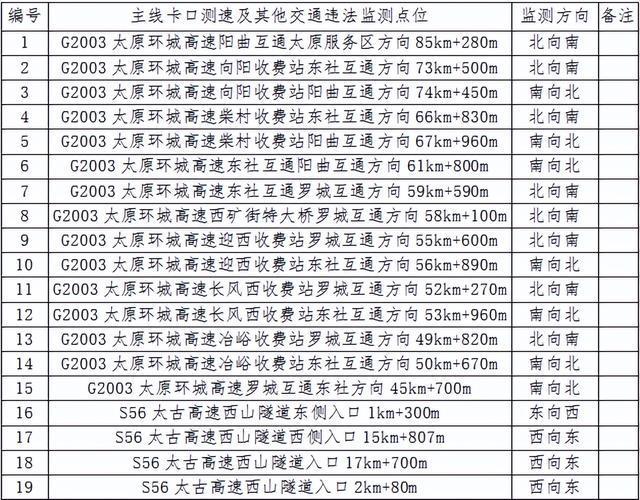 1. 主要 线路 卡门 速度 测量 和 其他 交通 非法 监测 点 :