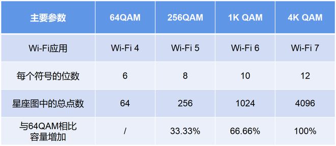 调制的目的是增加单一信号所携带的数据量。Wi-Fi6的最高调制模式是1KQAM,它包含10位元模块信号。后来,Wi-Fi6E出现,高通是首家引进高阶4KQAM调制方法的,这允许模块化信号携带12位元。在相同的编码下,速度可以提高20%。