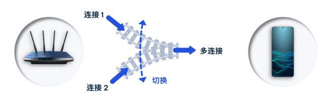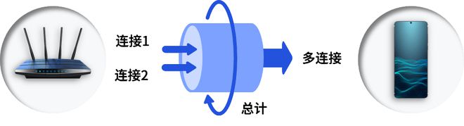 除了通道选择外,多联接技术还可以执行更强大的通道绑定,即同时创建两个不同频率的连接,这样两个数据连接都可以重复使用以获得更高的吞吐量。