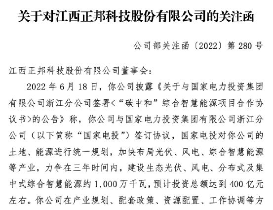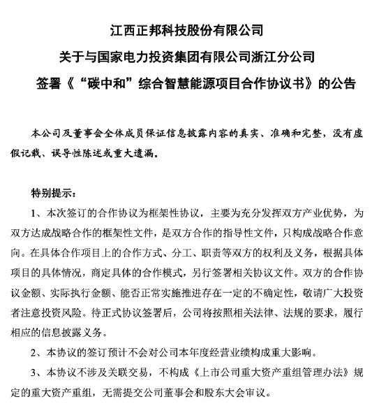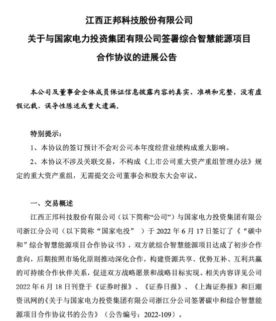6月17日盘后,正邦科技发公告称,同日,该公司与国家电力投资集团签署了一项综合智能能源项目。双方按照市场化原则促进深化合作,力争在三年时间内,建设太阳能电池、风力发电、分布式和集中式集成智能能源约10万瓦,预计总投资将达到约400亿美元。