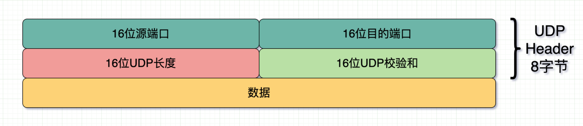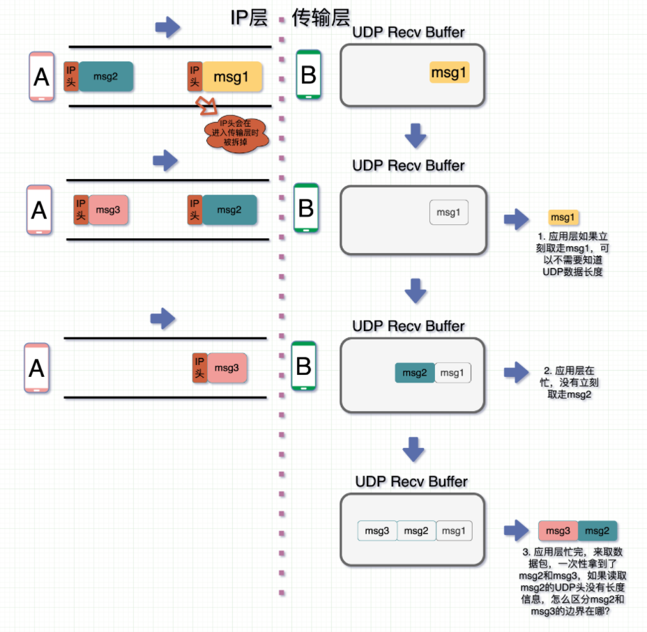 在标题中,16位用于表示UDP数据消息的长度,假设这个长度是n,以此作为数据边界。因此,接收端的应用程序层可以清晰地区分不同的数据消息,从头条开始,取 n 个位置,这是一个完整的数据报告,这避免了粘贴和包装的问题。
