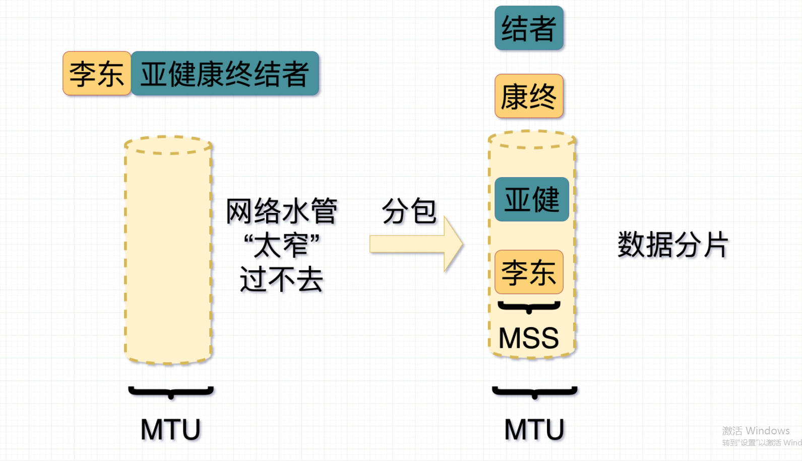 因此,当李东在手机上输入“李东”,在TCP中将消息分成MSS大小后,消息通过网络发送。