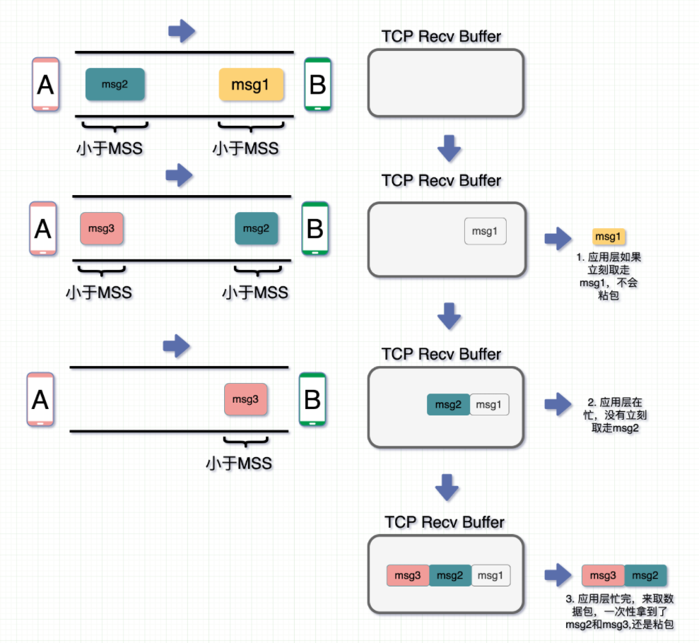 可以看到整个过程,从IP层到剪切的长度到将剪切成数据包的组装,只处理传输,不关心消息的边界和内容,不关心消息的内容,那么就不会有粘贴的包。