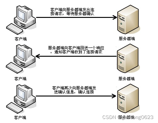 在TCP连接中,客户端和服务器必须清楚地标识,客户端向服务器发送连接请求,每个连接创建需要“三个手”。