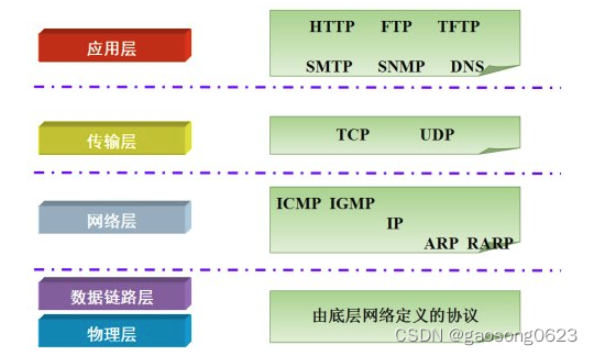 在上述图中,TCP/IP协议的四个层是应用程序层、传输层、网络层和链接层,每个层负责不同的通信功能。