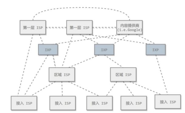 互联网是一个多层次的 ISP 结构, ISP 基于覆盖面积的大小。