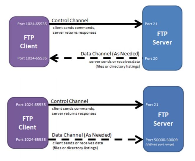 FTP在传输层中使用TCP,它还需要两个平行的TCP连接:控制连接和数据连接。控制连接在整个会议期间保持开放,数据传输完成后,数据连接被关闭。使用21号端口控制连接。数据连接使用20号端口。