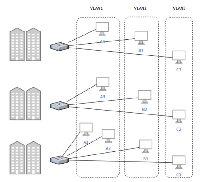 虚拟LAN可以创建与物理位置无关的逻辑群。只有同一虚拟域网的成员才能接收广播信息,例如,下图(A1,A2,A3,A4)属于虚拟域网,A1发送的广播将由A2、A3、A4接收,而其它站点收不到。