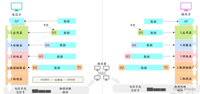 - AP首先将数据传递到主机的应用程序层,应用程序层加上该层的控制信息H5成为下一层的数据单元