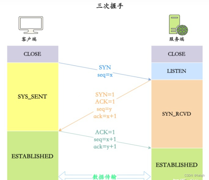 - 一开始,客户端和服务器都处于CLOSE状态,服务器对客户端的要求倾听并进入 LISTEN状态