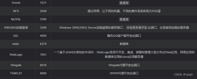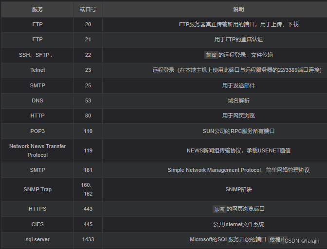 1)已知端口:从0到1023,系统保留的已知端口号码分配给特定服务。