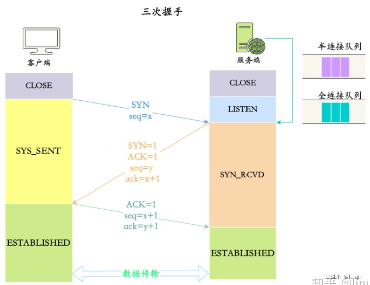 在TCP进入三个握手之前,服务端从封闭状态转换为 LISTEN状态,同时内部创建两个队列:半联队列(SYN队列)和全联队列(ACCEPT队列)。