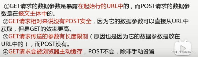 - 此外,从正式的角度来看,GET请求将数据放在URL上是较不安全的,而 POST请求将数据放在请求机构上则比起来更安全。