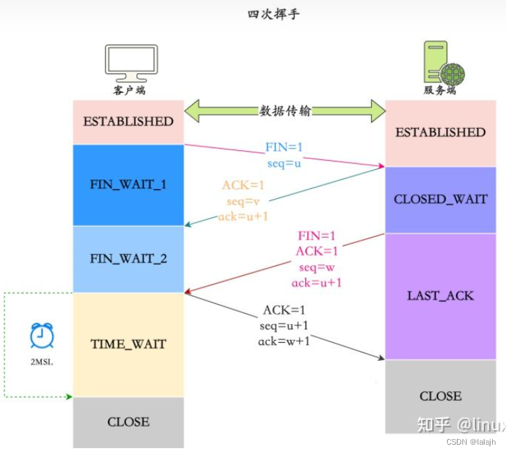 - 服务器发送释放连接消息,第三次挥动(FIN=1, ACK1, seq=w, ack=u+1),然后发送后,服务器进入LAST_ACK状态,等待客户端的最后ACK。