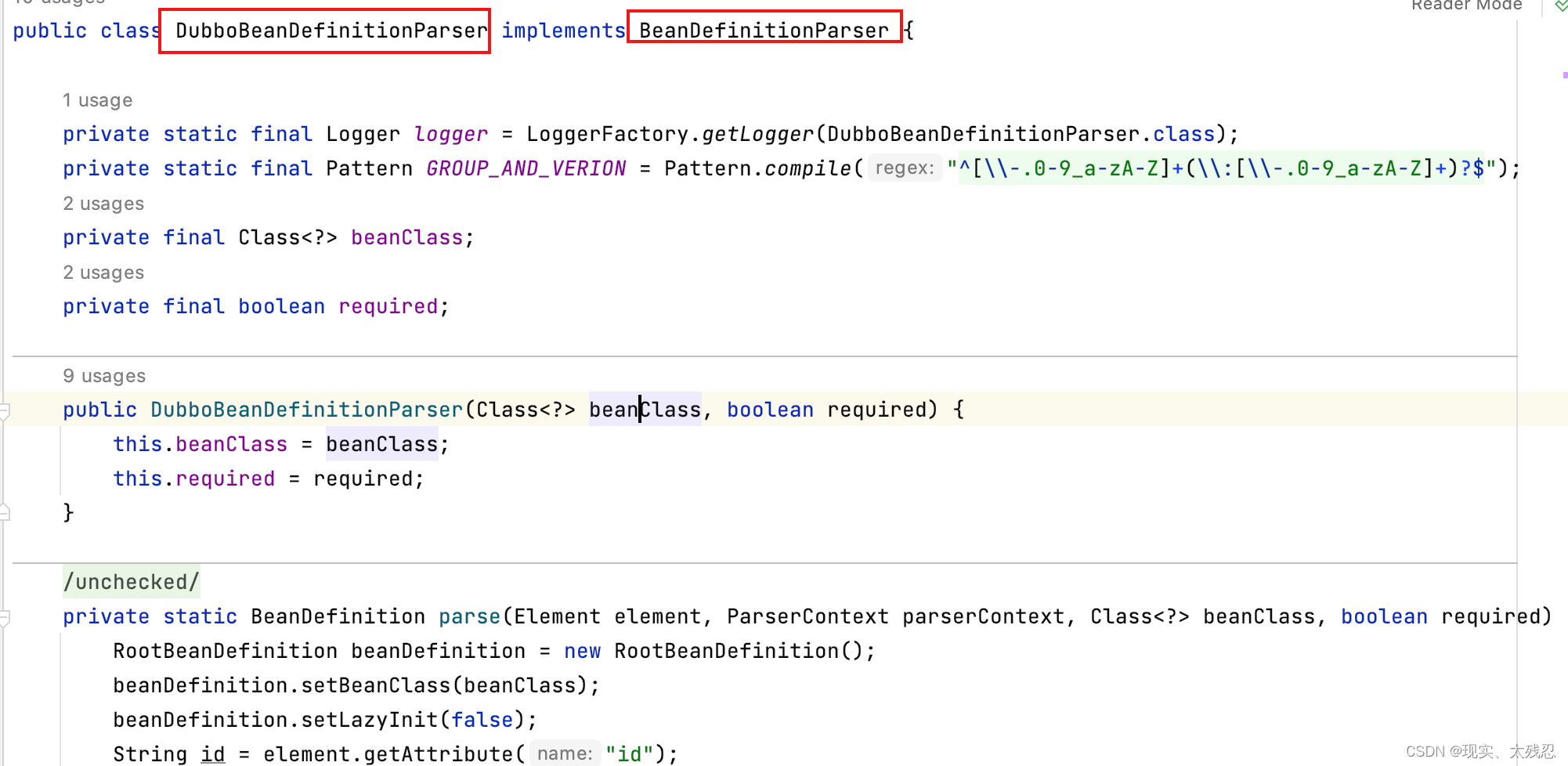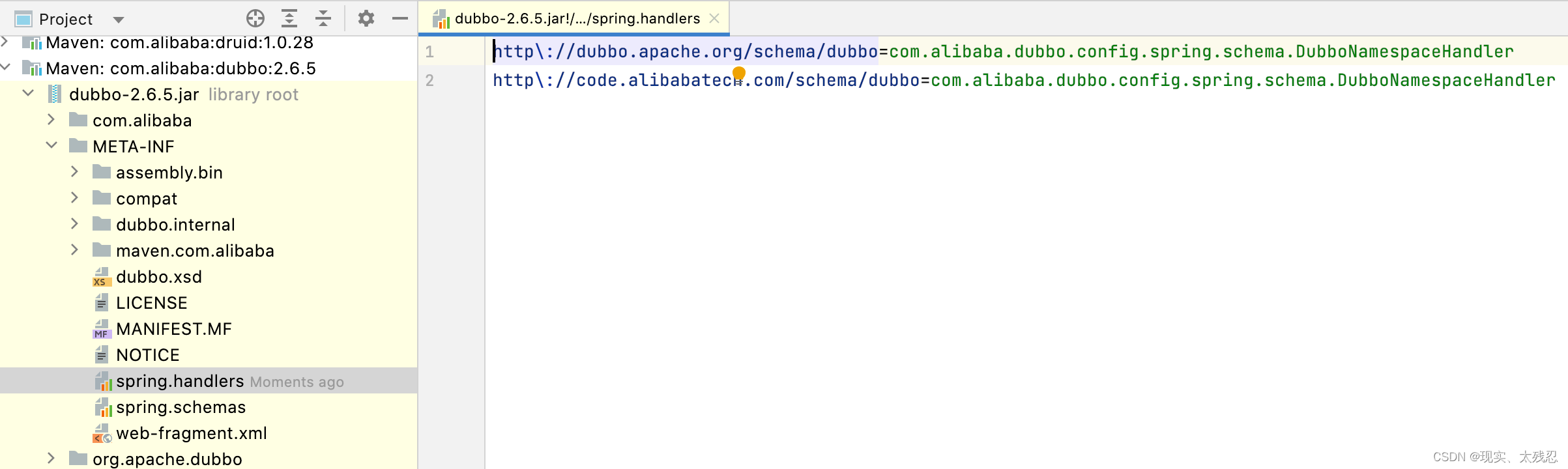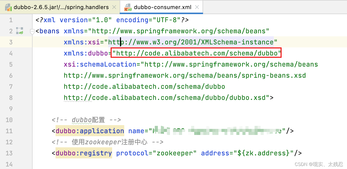 一个包含 dubbo的名称的命名空间, dubbo.Spring将在xml引入 Spring.handlers文件后找到 spring,找到相应的命名空间处理器 DubboNamespaceHandler