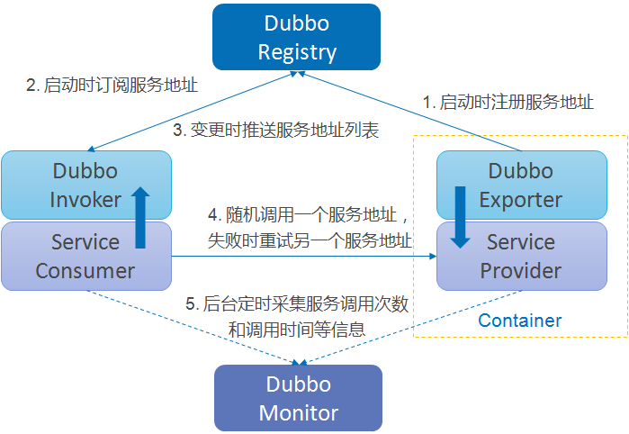 - 服务消费者根据软负载平衡算法从提供者地址列表中选择一个提供者,如果调用失败,则选择另一个提供者。
