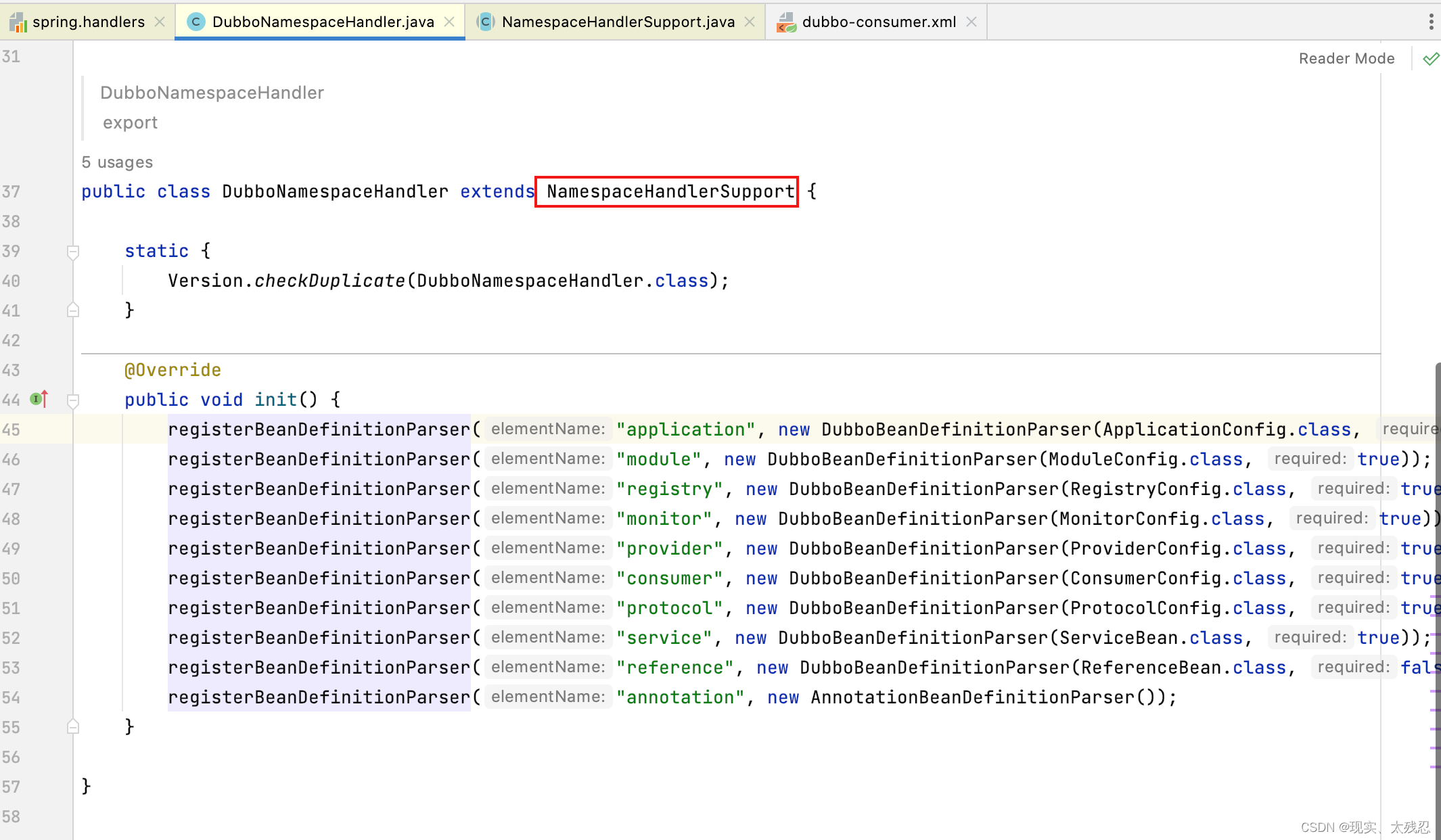 同时, DubboNamespaceHandler继承了spring's NamspaceHandlerSupport,将执行init方法,初始化解析器,有应用程序、模块、注册表..等很多。