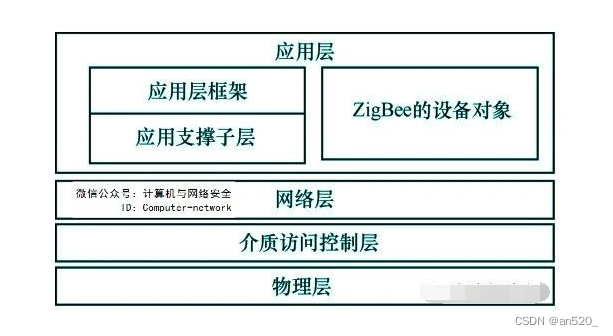 物理层为IEE 802.15。它与IEE802兼容,与11项协议类似,都是无线网络协议。媒体访问控制层与物理层相同,是由该协议定义的,该层还包括构建一个扩展的ZigBee网络的功能,例如连接设备之间的拓扑结构、数据帧的结构设计、网络上的“设备特性”和“建立关联”和“移除关联”等。网络层和应用层根据ZigBee标准定义,其中,网络层主要负责实现高级功能,例如, 网络程序, 设备发现, 地址分配, 数据路由.应用程序层是该协议堆栈的最高级别,指定应用程序对象的操作和接口。