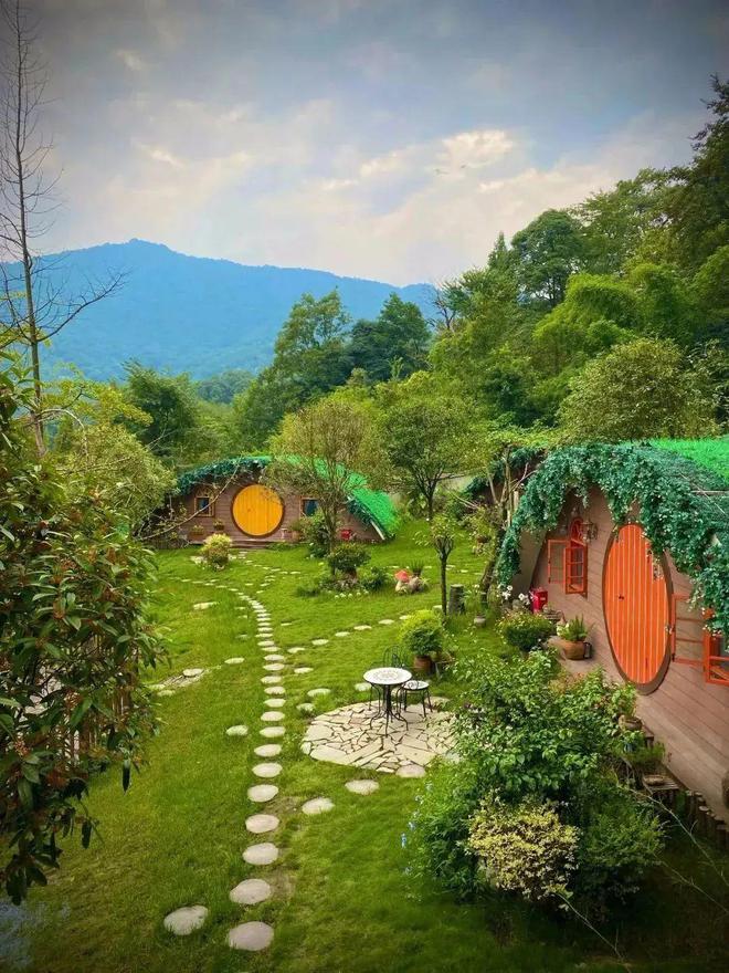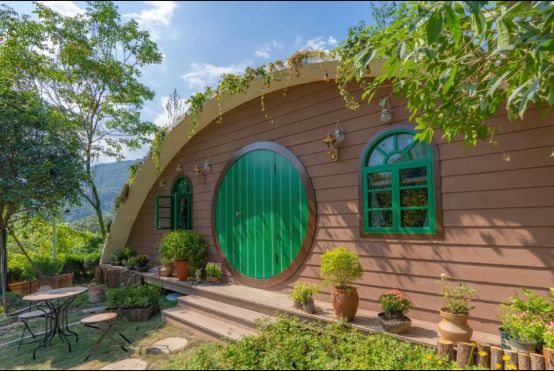 旅馆配备了五座典型的哈比特主题旅馆,一个新的流动创意主题旅馆,环保,自然,主要使用自然材料布局,完美 recreate the scenes in the movie.