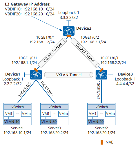 VXLAN隧道在设备1、设备2和设备3上配置。