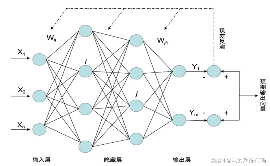 BP神经网络是一种基于多层传感器的多层反馈神经网络,用于提高误差逆转传输信号,用于处理非线性连续函数。该网络由输入层、隐性层、输出层组成,其主要特点是信号前继传输、误差逆转传输,可用于系统模型识别、预测或控制。在向前传输中,输入信号由输入层通过隐性层处理到输出层。每个层的神经元状态只影响下层的神经元状态。如果输出层不能取得预期输出,则将转换为逆传播,根据预测误差调整网络功率和阈值,使BP神经网络能持续地预测输出更接近预期输出,其拓扑结构图如图1所示: