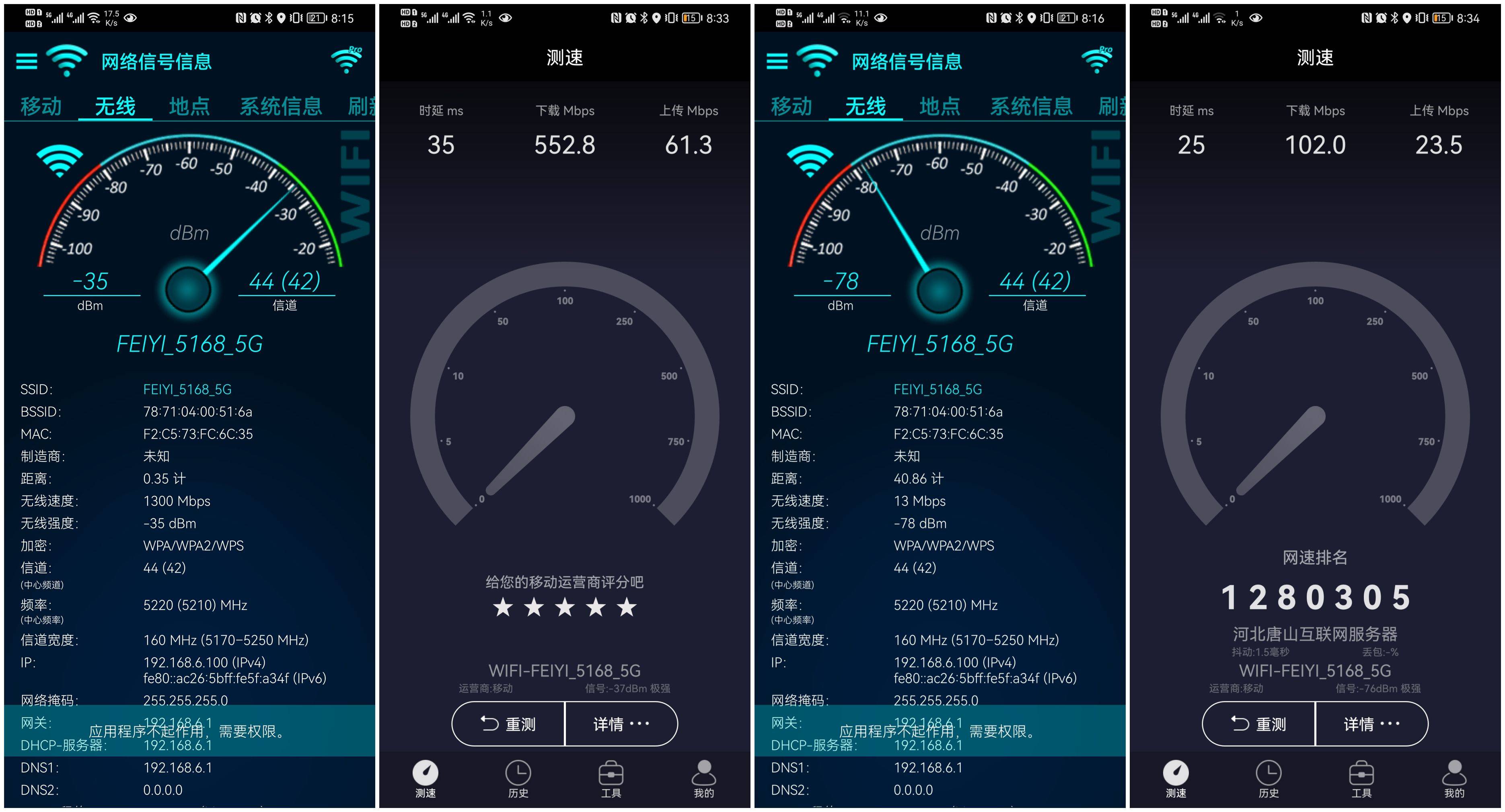 我以前也有其他类型的无线路由器,两墙间的卧室信号并不十分令人满意.躺在床上玩手机时,你经常要把手机伸到脚部,让我们把它靠近老路由器,然后再强迫信号.同时下载速度超慢,而且这个AX300 WIFI 6无线双频路由器性能很好,虽然看起来两堵墙的信号强度并不太强,但下载速度很好,它比我的老路由器多三四倍,虽然它尚未达到理论的网络最大速度300Mbs,但实际上的500Mbs也第一次被看到。