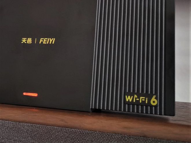 正方形的黑色外观是硬的,前面有金色的标志和指示灯,右下角的 WIFI6标识器显示其身份。