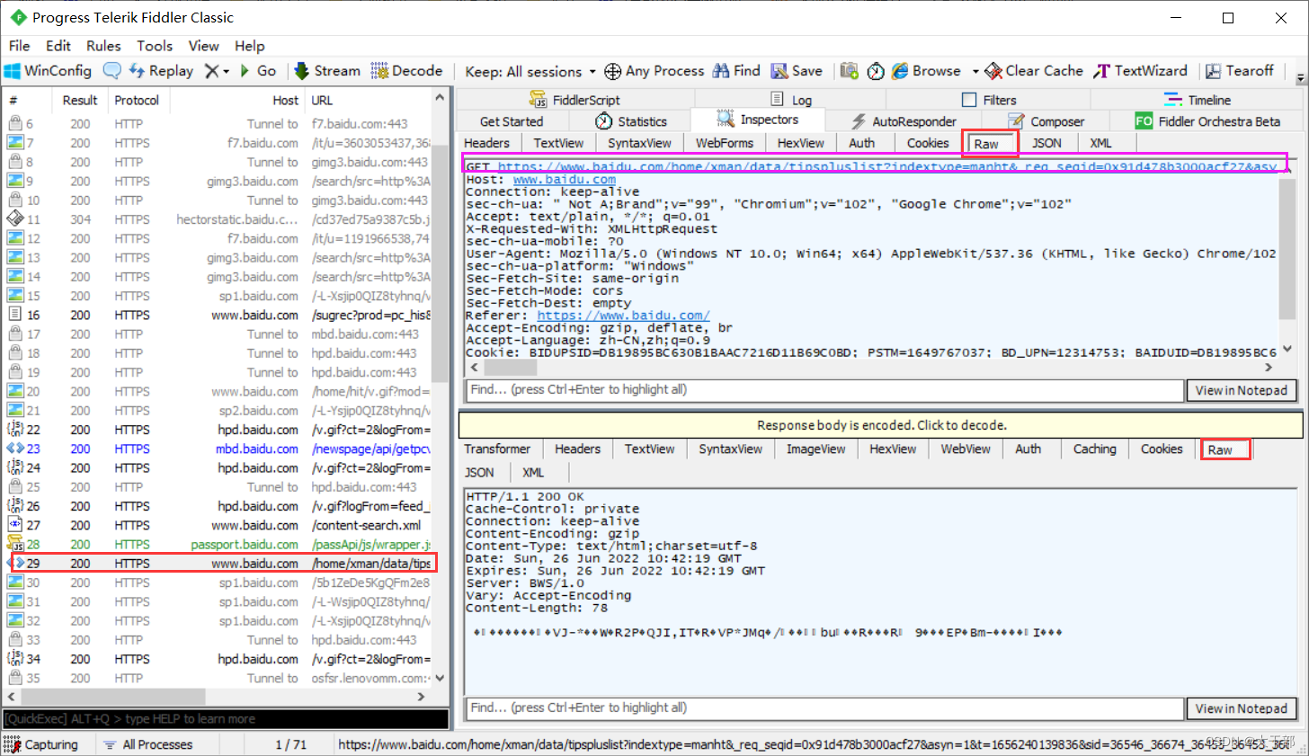 - 左窗显示所有HTTP请求/响应, 选择请求查看细节.