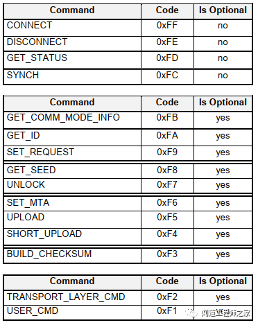 XCP协议标准中的命令由PID定义,根据XCP所支持的不同功能,上位主发送给控制器,控制器发送给上位主的PID命令定义有相应的区别: