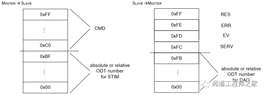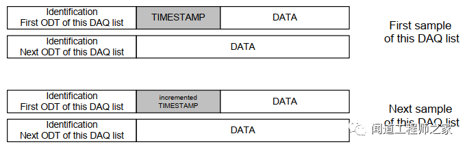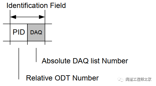每次传送DAQ数据,DAQ列表符号和当前传送的数据在DAQ列表中的ODT数据编码中指定。PID的定义包含两个部分:DAQ列表编号和ODT数据编号。DAQ列表编码可以根据需要定义为单字和双字类型。