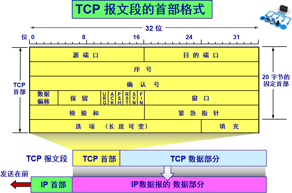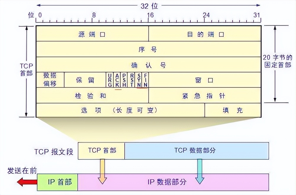 在数据传输到应用程序层之前,在消息中表达的TCP协议是添加一个TCP字节的,这个字节添加了TCP信息,让我们看这个字节的整体结构: